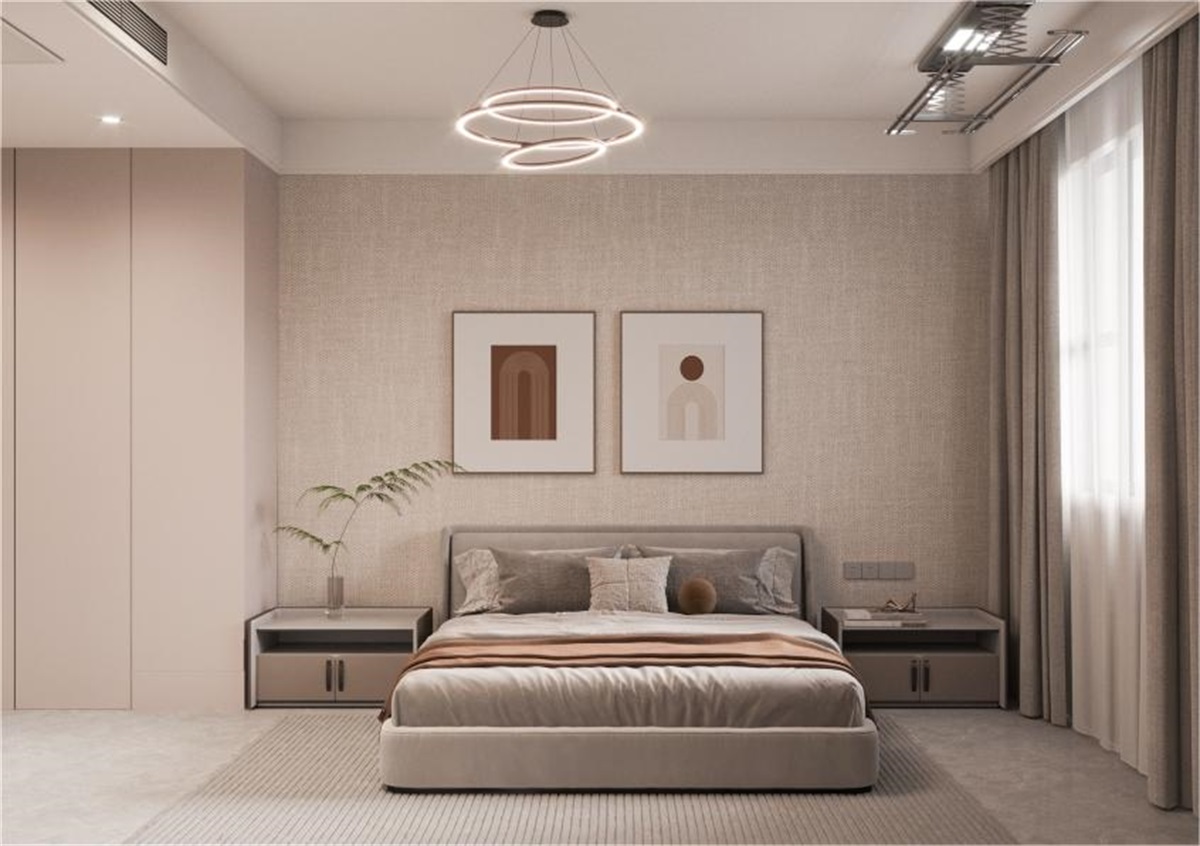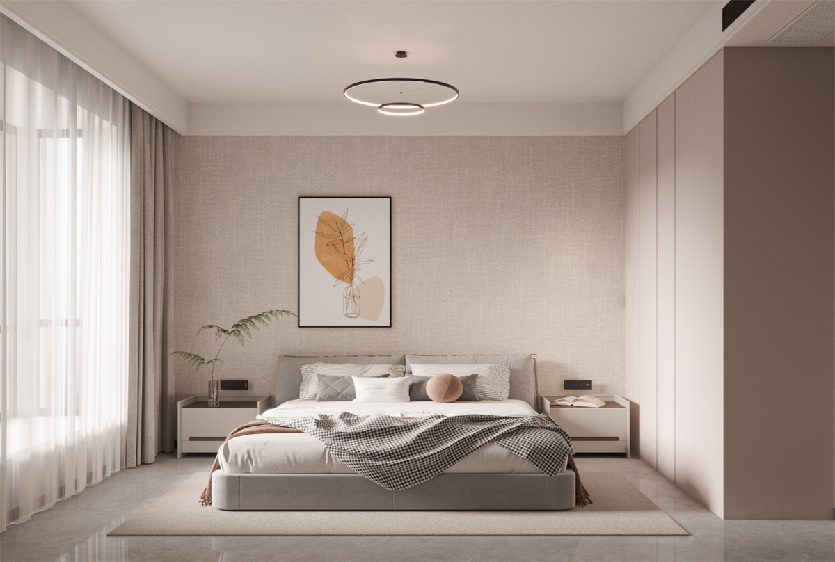 主臥設(shè)計以簡約為主,飄窗將室內(nèi)空間與外部環(huán)境融為一體,最大限度地引入自然光線,為居住者營造出寬敞明亮的居住環(huán)境。