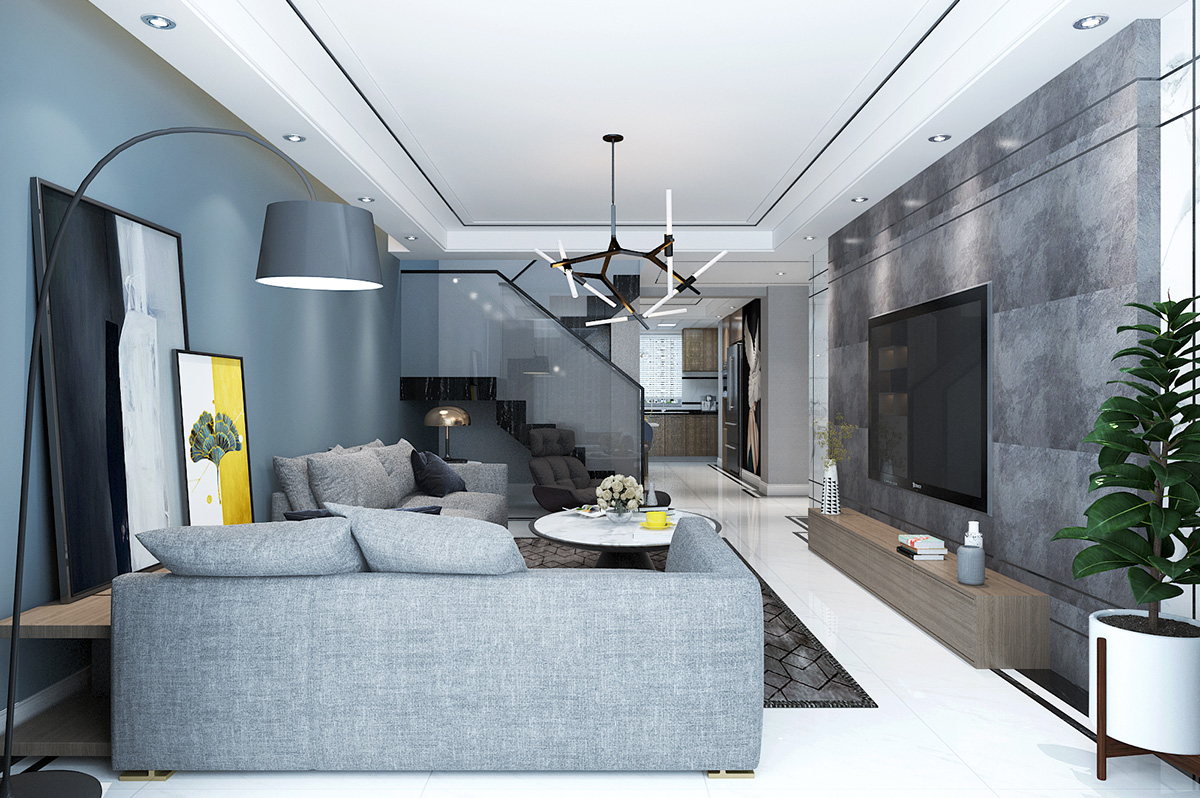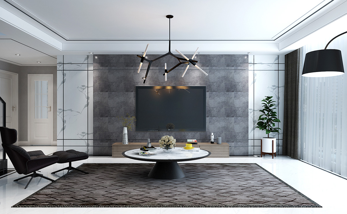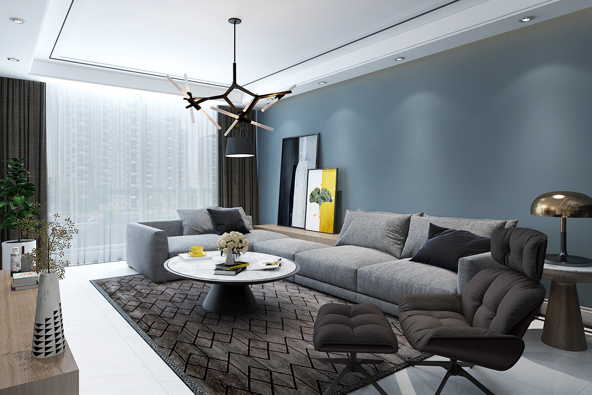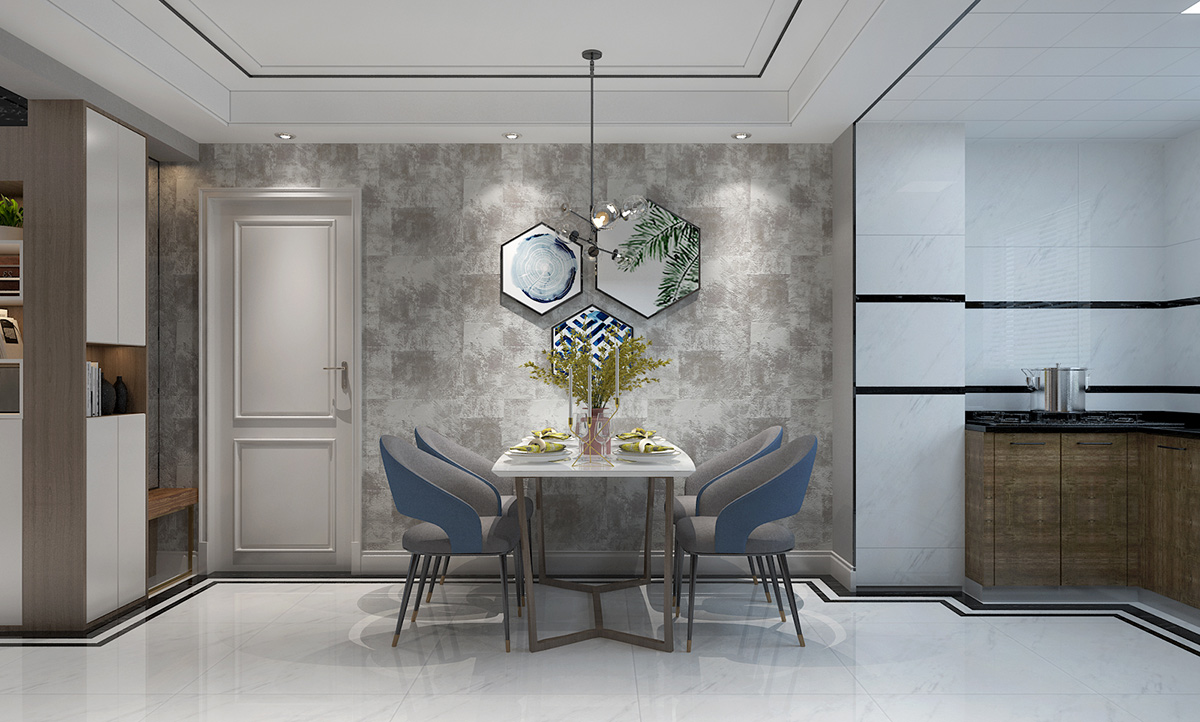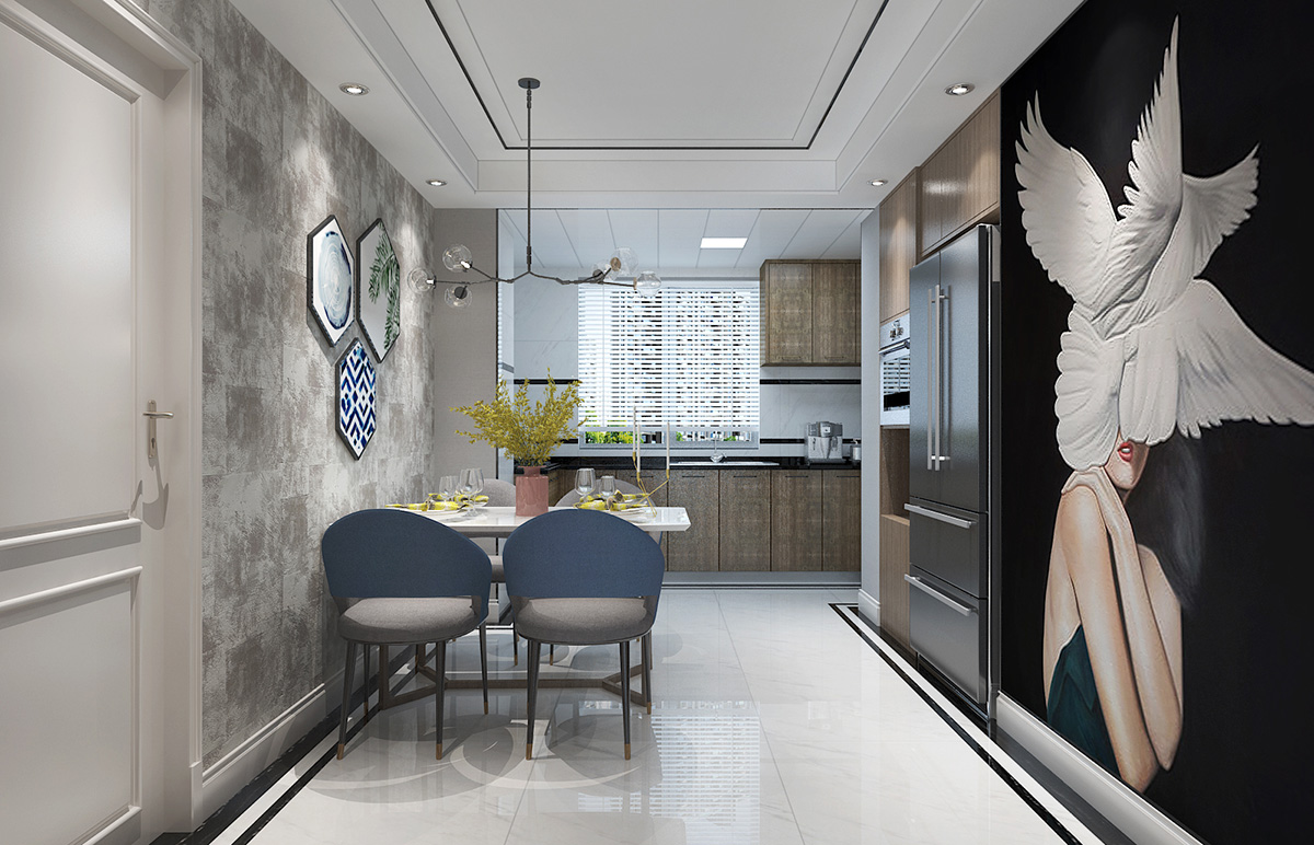 灰藍(lán)色系的背景墻為整個(gè)空間增添了一絲春意,使整個(gè)空間不至于過分單調(diào)。