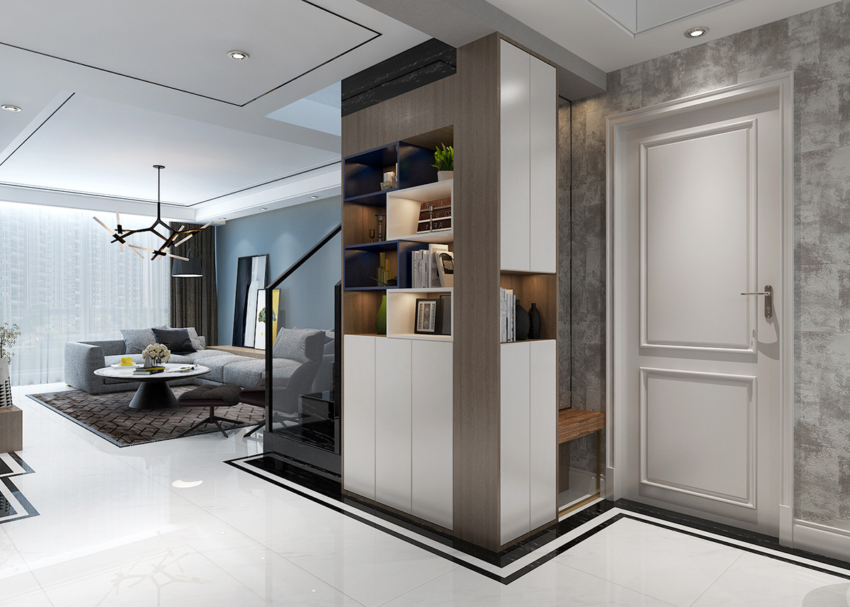 入戶鞋帽柜與樓梯下方收納柜作為以整體,增加了儲(chǔ)物空間的同事又增添了一抹趣味感。