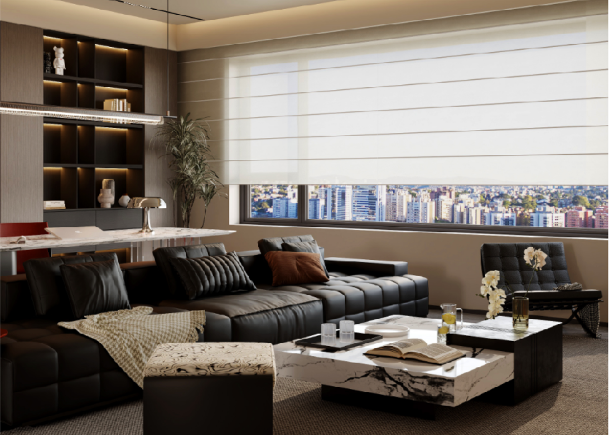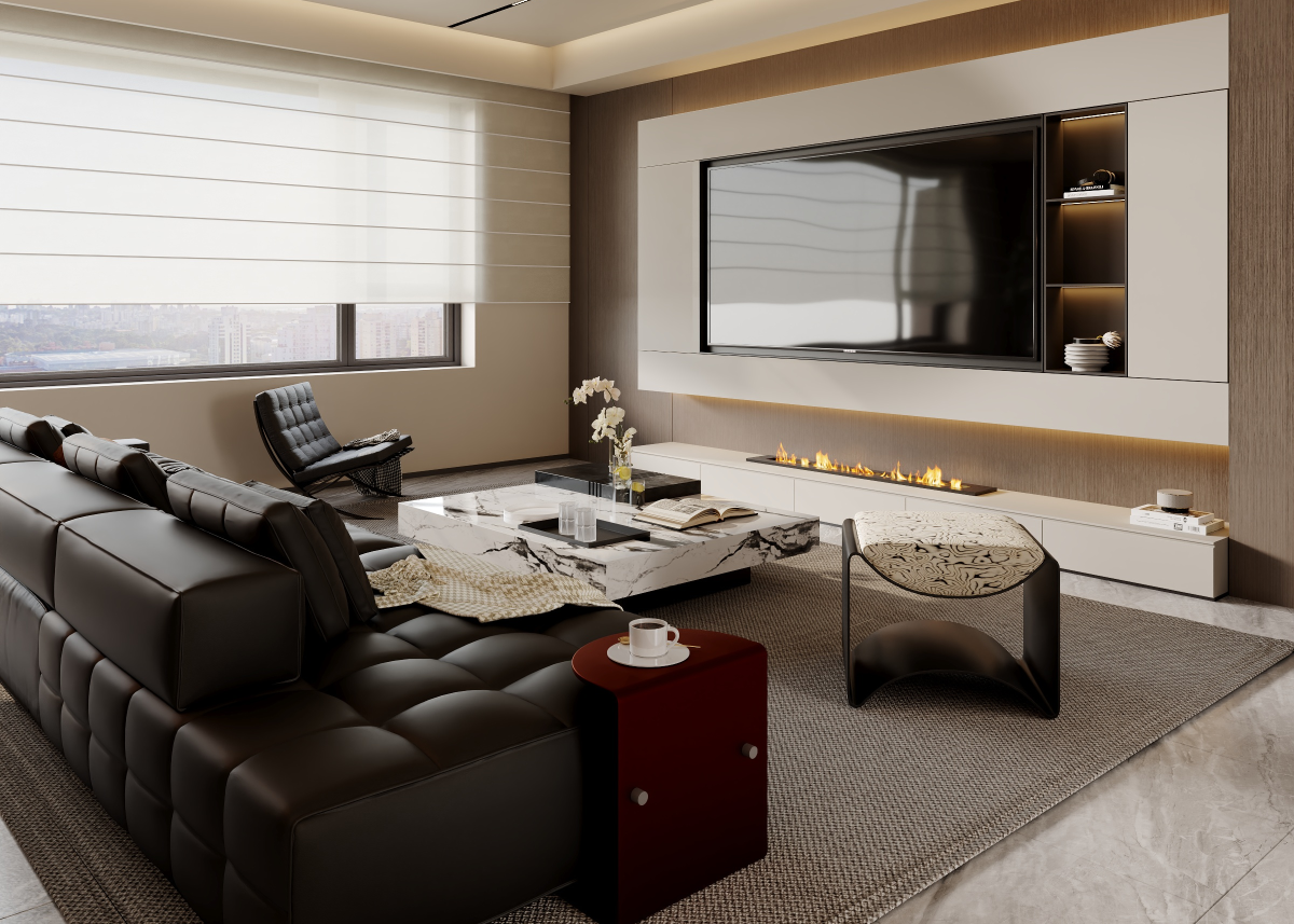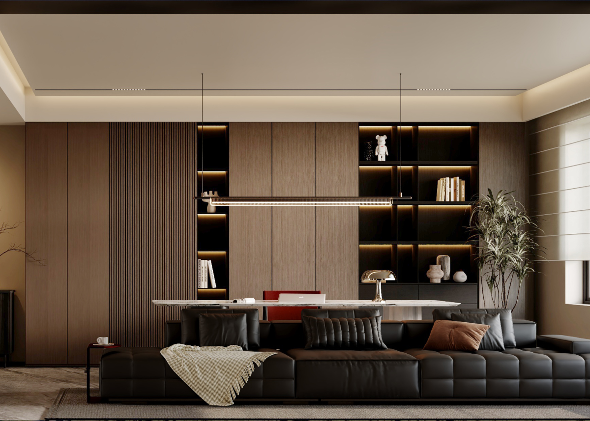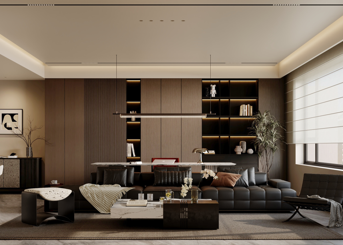 淺咖與深棕的木質(zhì)元素打底,搭配沉穩(wěn)的黑色皮質(zhì)沙發(fā),材質(zhì)的碰撞讓空間層次分明。