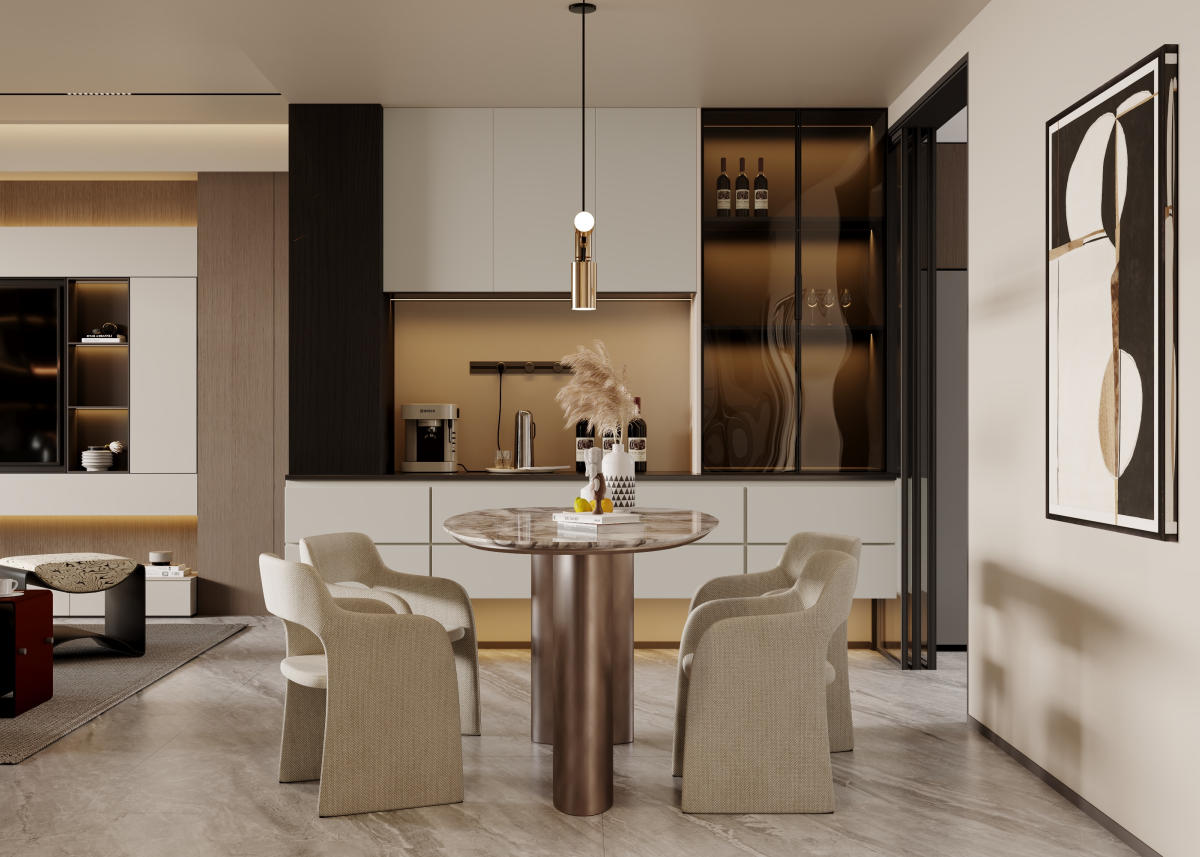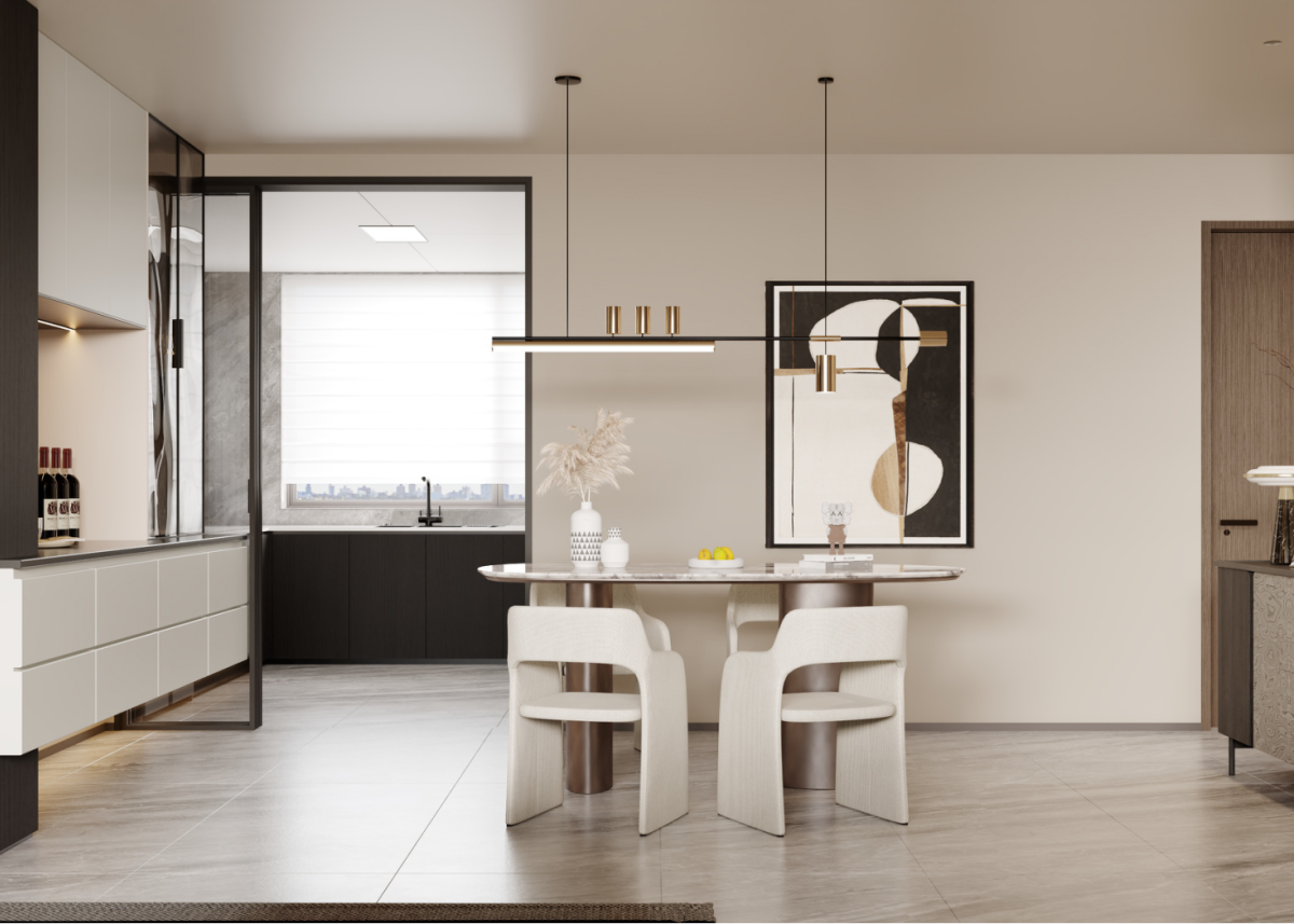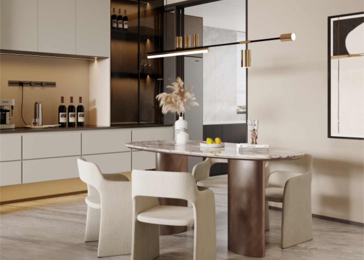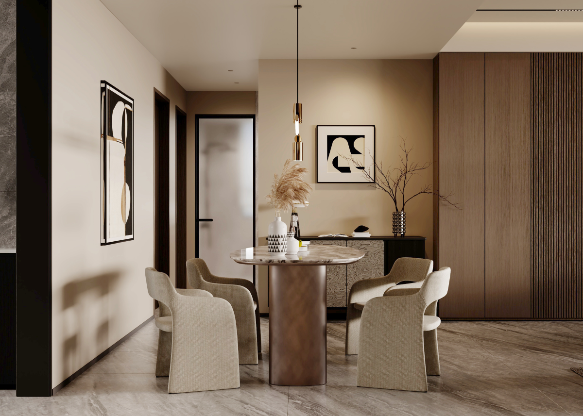 餐廳是煙火日常的承載,也是享受美食的儀式空間。橢圓大理石餐桌自帶天然紋理,搭配弧形布藝餐椅,柔和線條消解硬朗感。簡(jiǎn)約吊燈垂墜而下,聚焦用餐氛圍。