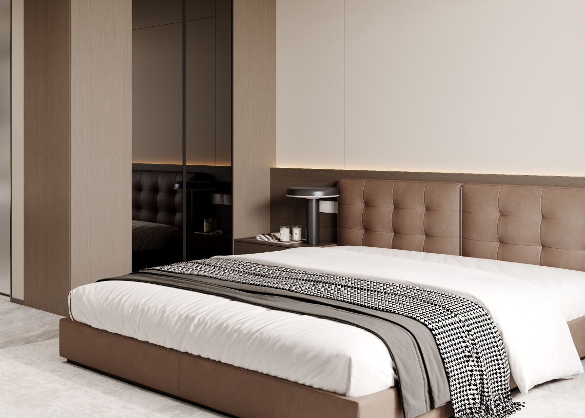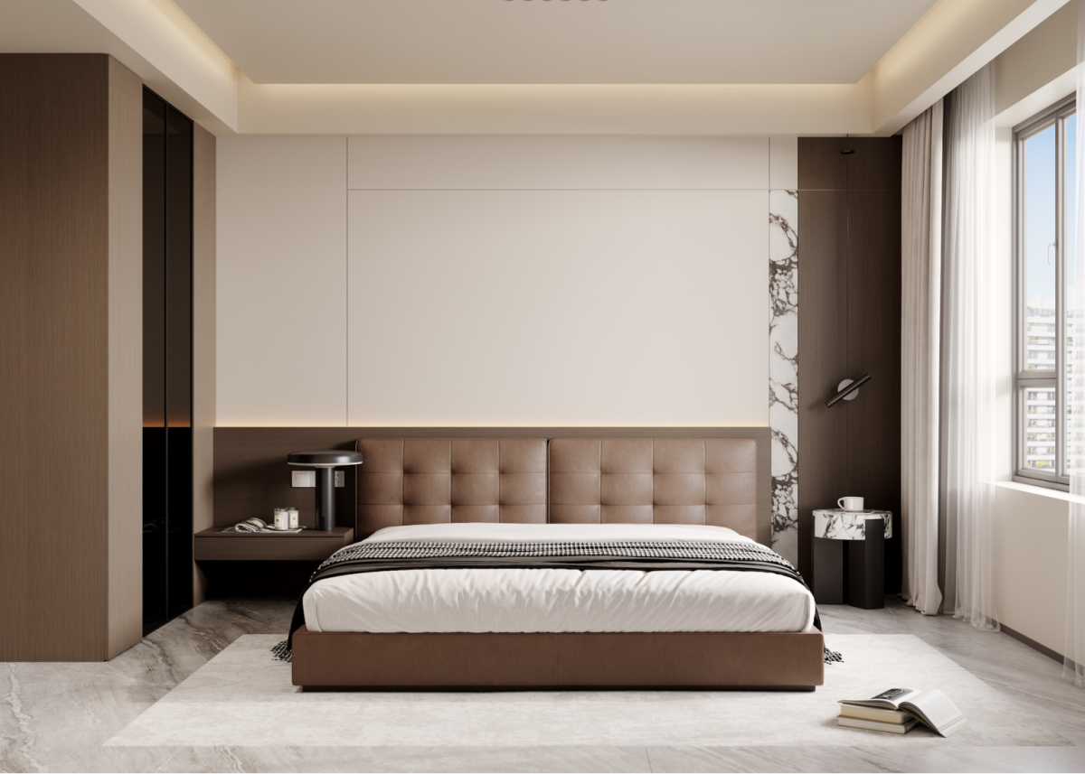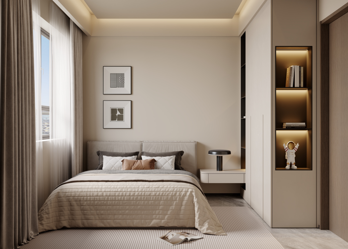 主臥用低飽和的米咖色調(diào)鋪滿空間,溫柔包裹感官。無(wú)主燈設(shè)計(jì)讓頂面簡(jiǎn)潔干凈,線性燈與床頭壁燈配合,睡前閱讀有專屬柔光,晨起拉開窗簾,自然光傾瀉而入,喚醒美好日常。
