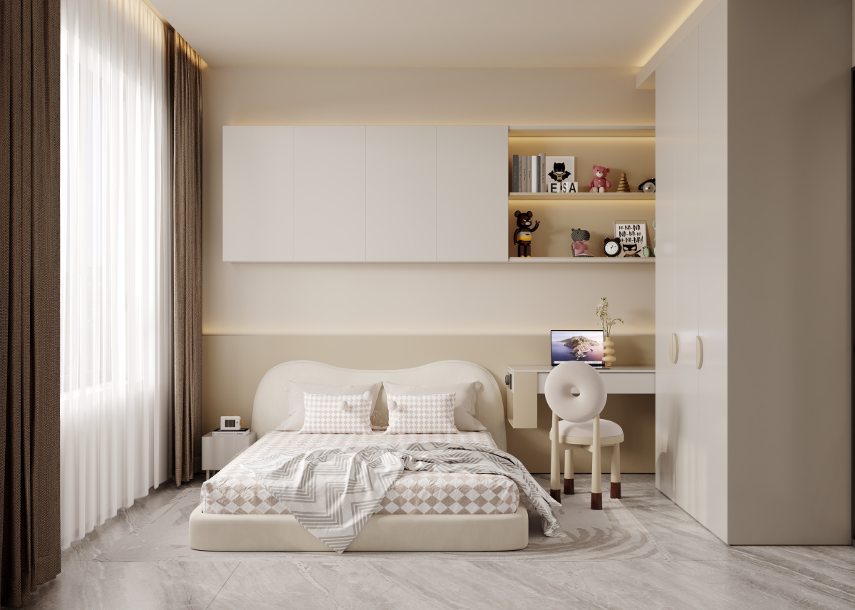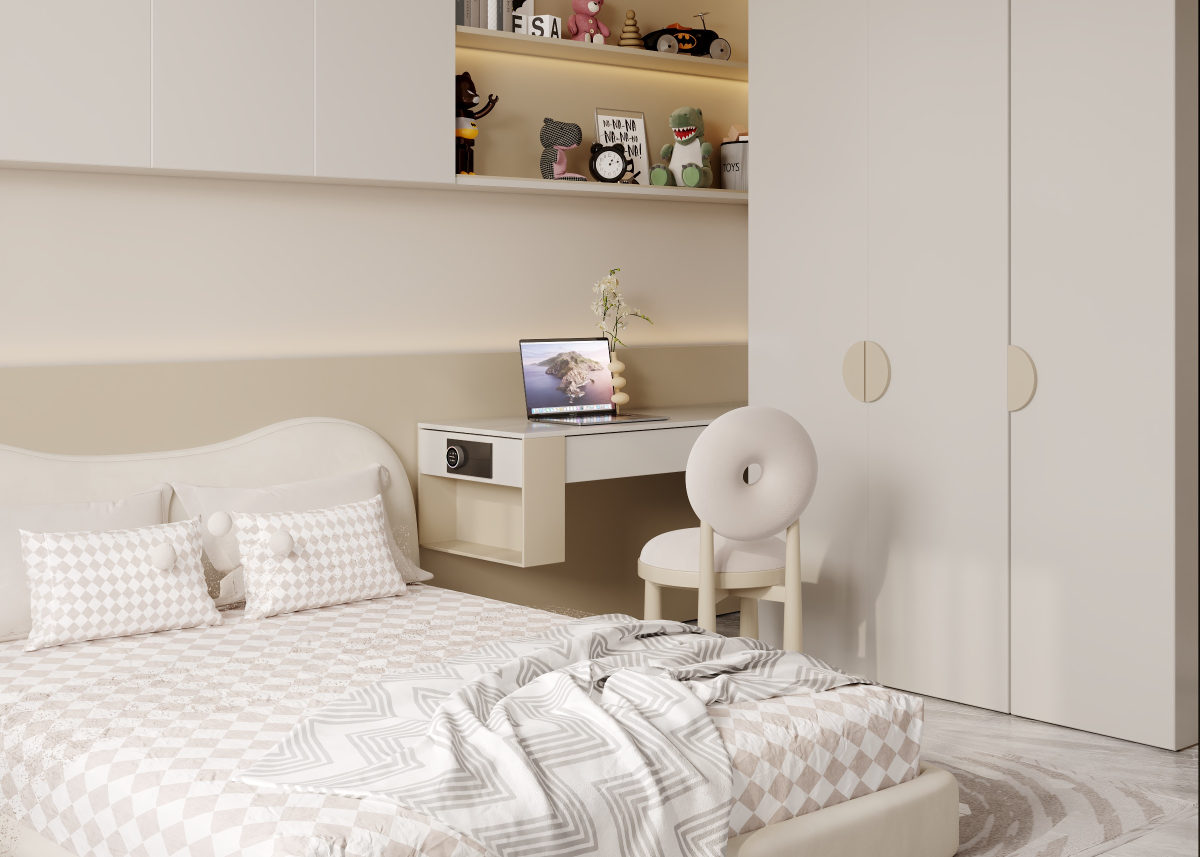 兒童房守護(hù)童真又兼顧實(shí)用性,奶油白與淺咖為主色調(diào),營(yíng)造柔和氛圍。云朵造型床頭自帶可愛(ài)屬性,定制墻柜集收納、展示于一體。這個(gè)簡(jiǎn)約又充滿巧思的小空間,是孩子童年的成長(zhǎng)容器,裝得下童趣,也預(yù)見未來(lái)的蛻變。