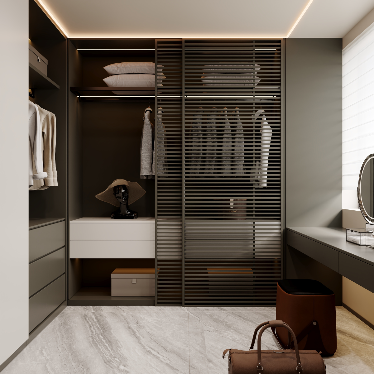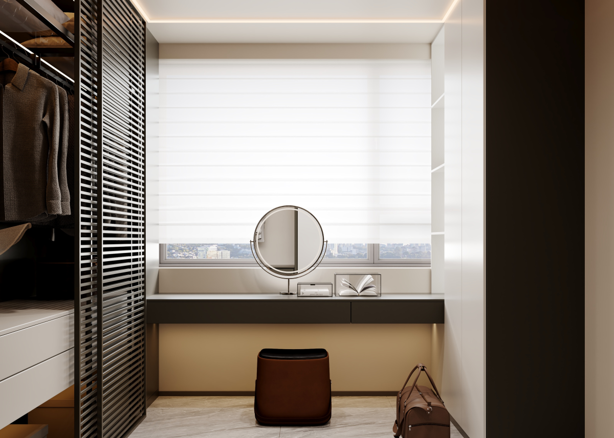 利用一間次臥做獨(dú)立衣帽間,兩側(cè)收納,中間梳妝;同時(shí)一側(cè)衣柜柜門采用推拉式,預(yù)留充足的動(dòng)線空間,避免磕碰。
