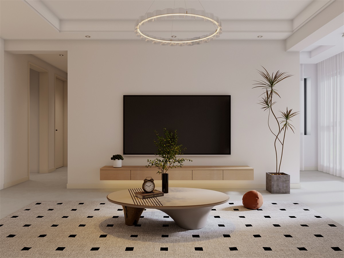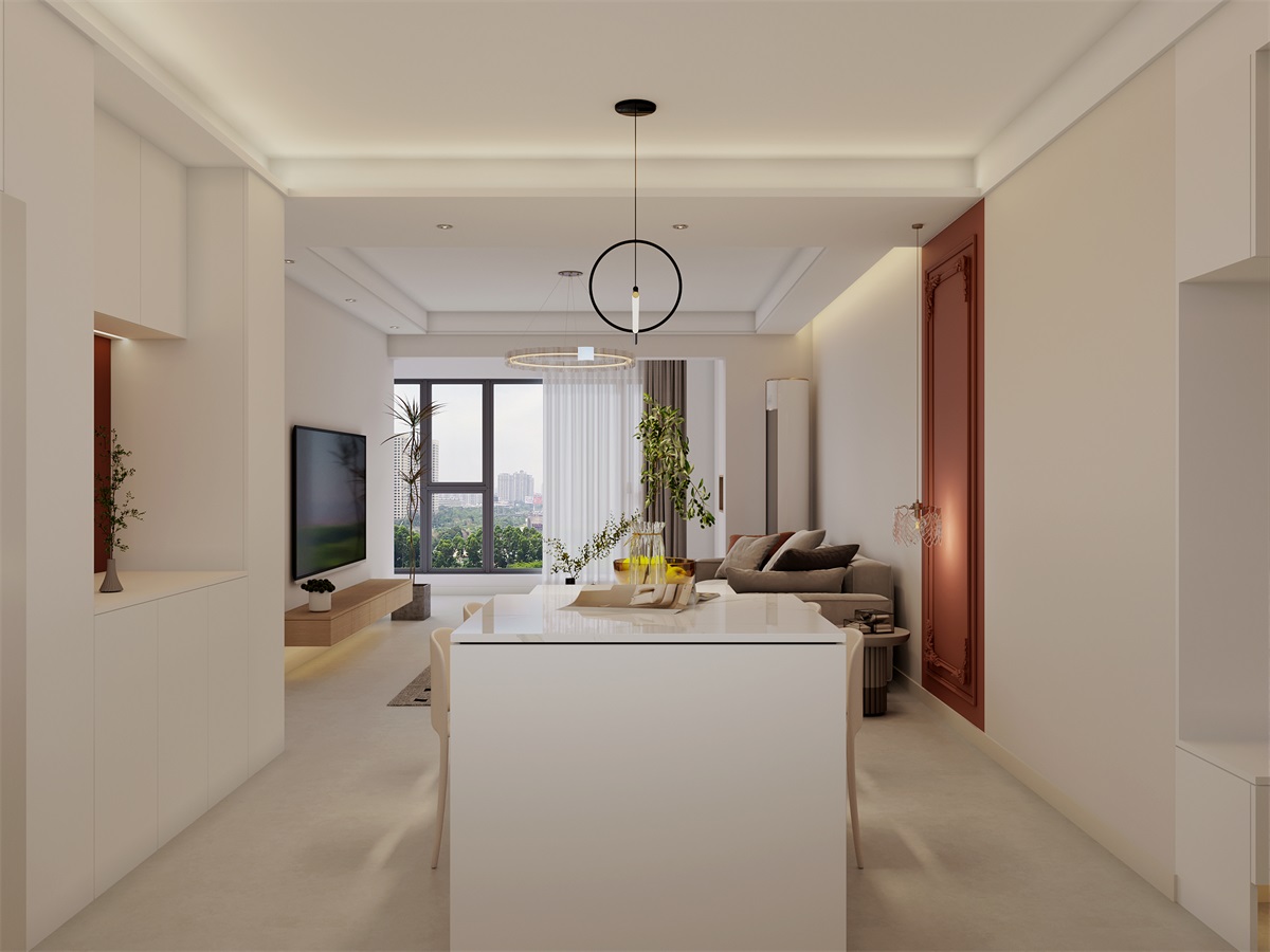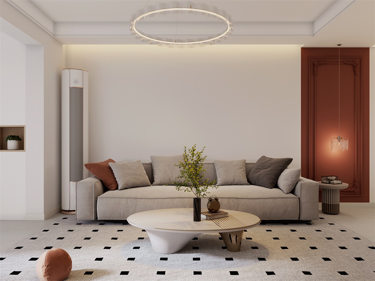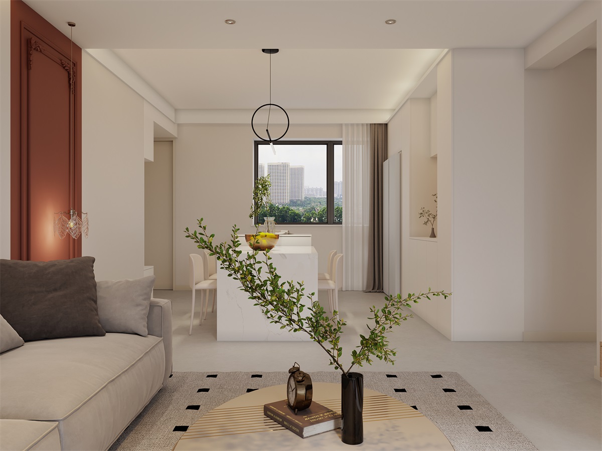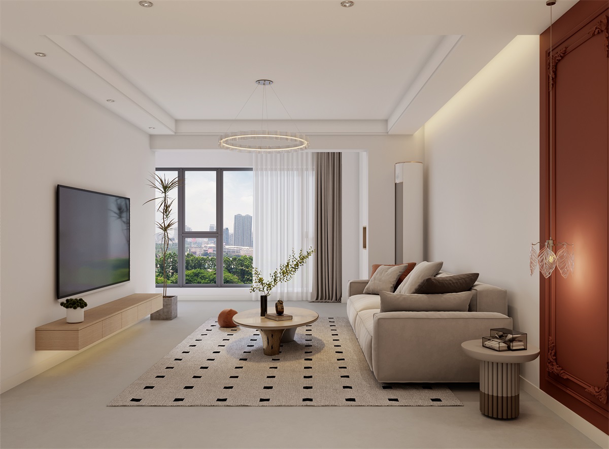電視背景墻不做任何裝飾,柜體懸空,奉行“少即是多”的準(zhǔn)則,最大程度上剔除一切繁瑣的程序。 醒目的紅色闖進(jìn)這一方靜謐空間中,精致的石膏線雕花為這個(gè)簡(jiǎn)潔的現(xiàn)代空間帶來一絲法式的浪漫氛圍。