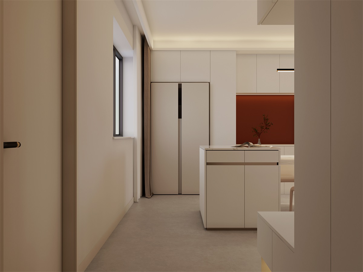 餐廳采用島臺(tái)+餐桌一體的設(shè)計(jì),相當(dāng)于延伸出了一個(gè)烹飪輔助臺(tái),備菜或置物都能派上用場(chǎng)。