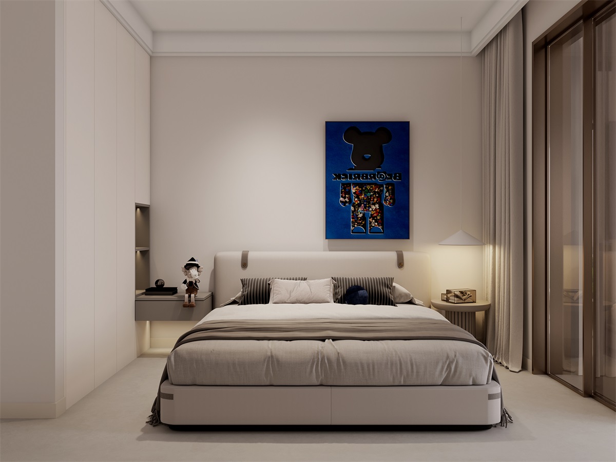 主臥在白色的基底上加入米色,顯現(xiàn)出深淺不一的層次變化。以衣柜作為隔斷,分隔出主衛(wèi)和睡眠區(qū)。
