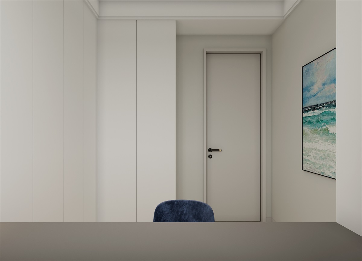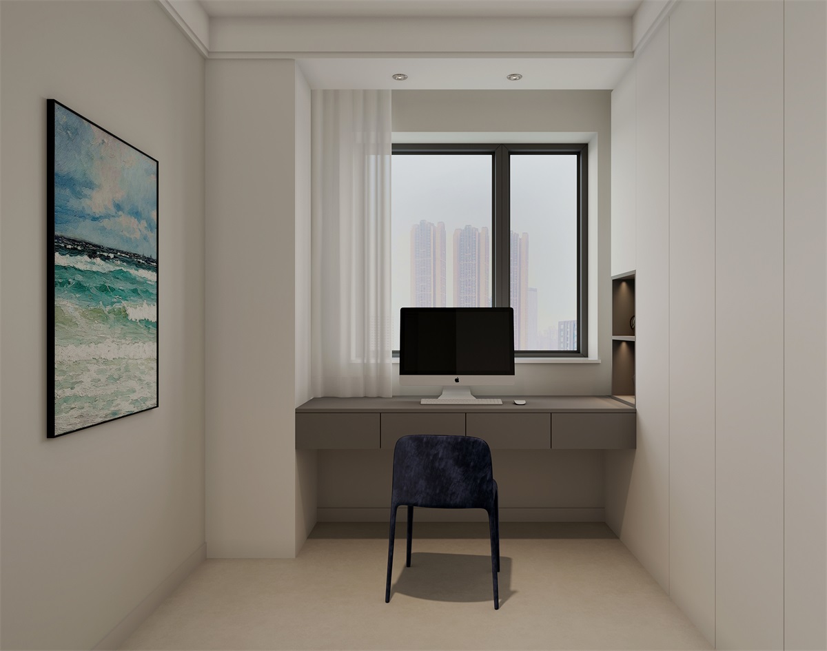 另一間次臥業(yè)主將其作為多功能房間來使用,靠墻打造整面通頂柜,承接獨(dú)立衣帽間的作用。同時(shí)擺放書桌,將其作為書房也未嘗不可。